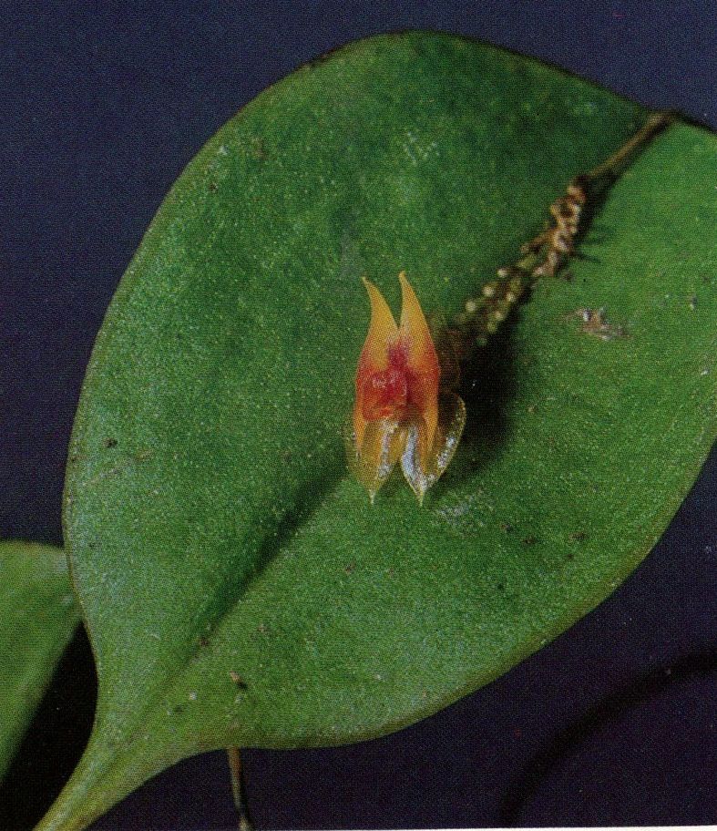 Found in Antioquia and Narino departments of Colombia in cloud forests at elevations around 1600 to 2000 meters as a mini-miniature sized, cool to cold growing epiphyte with slender, erect ramicauls enveloped completely by 10 to 11, close, glabrous to microscopically scabrous, lepanthiform sheaths and carrying a single, apical, spreading to deflexed, thinly coriaceous, elliptic-ovate, obtuse, contracted into a linear apical segment, rounded and abruptly contracted below into the short petiolate base leaf that blooms in the later spring and fall on a, filiform, very congested, distichous, .64 to .8" [1.6 to 2 cm] long including the .12 to .28 ” [3 to 7 mm] long peduncle, successively single, few flowered inflorescence arising on top of the leaf.