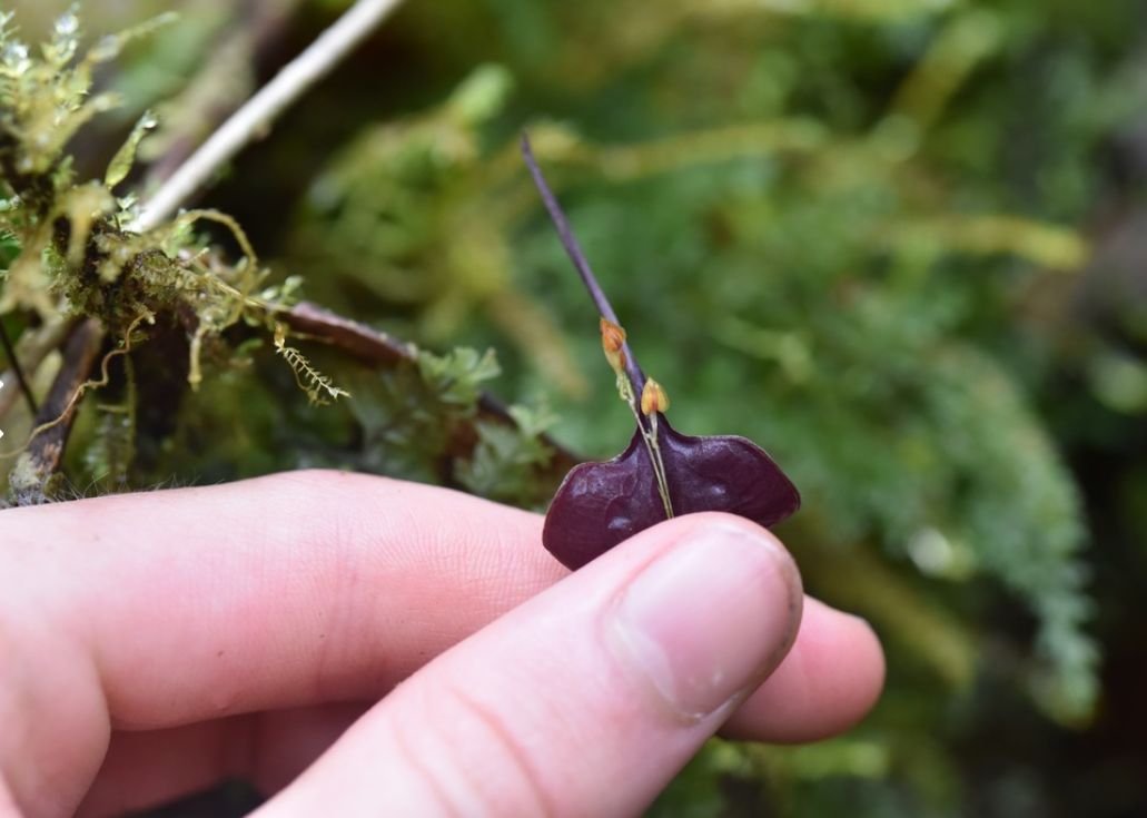Found in Imbabura province of Ecuador at elevations around 2100 meters as a mini-miniature sized, cold growing epiphyte with a very slender, weak, suberect ramicaul enveloped by 8 to 14, microscopically scabrous lepanthiform sheaths carrying a single, apical, spreading to horizontal , thinly coriaceous, bilobed, cordate apically, abruptly contracted into a linear apical segment, the lobes suborbicular, abruptly acuminate below into the petiolate base leaf that blooms in the summer on a slender, congested, disitchous, to 1.8" [to 4.5 cm] long, successively several flowered inflorescence arising on the top of the leaf.
