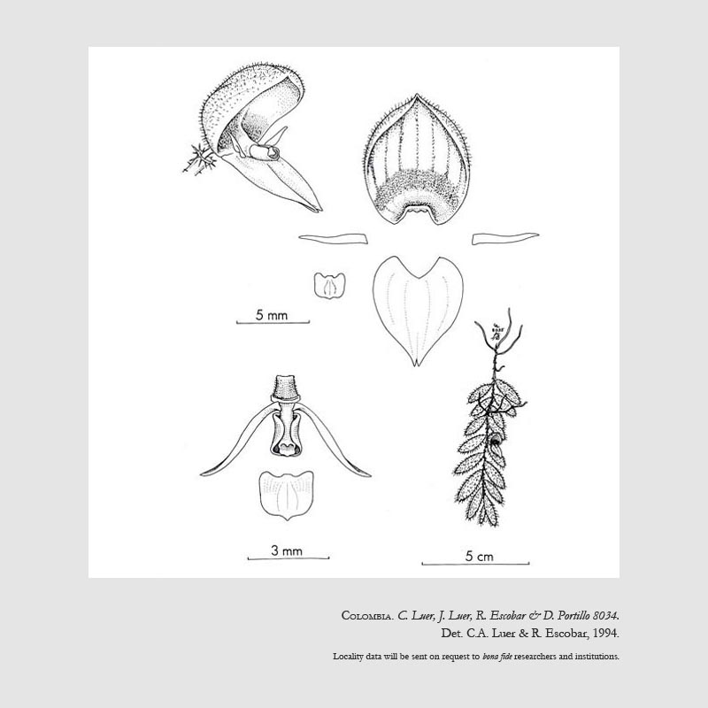 Found in Boyaca department of Colombia in scrub forests at elevations around 2600 meters as a medium sized, cold growing epiphyte with pendent, branching rhizomes giving rise to abbreviated ramicauls concealed by a ciliate lepanthiform sheath and carrying a single, apical, pendent, largest of the genus, coriaceous, densely villous, elliptical, acute to subacute apically, 5 veined, contracted below into the petiolate base leaf that blooms in the spring on a slender, ascending, congested, .02 to .04" [.05 to 1 mm] long, successively few flowered inflorescence with a ciliate floral bract