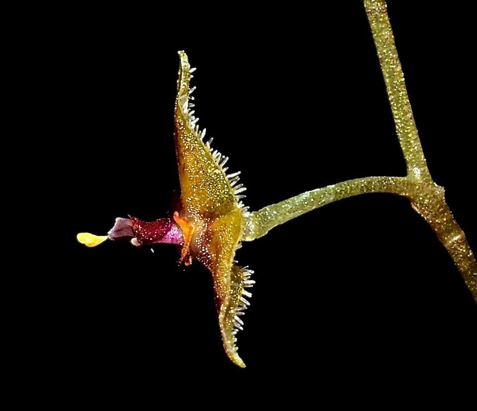 Found in Ecuador in cloud forests at elevations around 2300 meters as a miniature sized, cold growing epiphyte with erect, slender ramicauls enveloped by 8 to 11, microscopically scabrous, lepanthiform sheaths and carrying a single, apical, erect, coriaceous, elliptical, narrowly obtuse, cuneate below into the petiolate base leaf that blooms in the fall on a slender, elongating, 4" [10 cm] long, flexuous, successively several to many flowered inflorescence with 2 to 4 simultaneously opening flowers