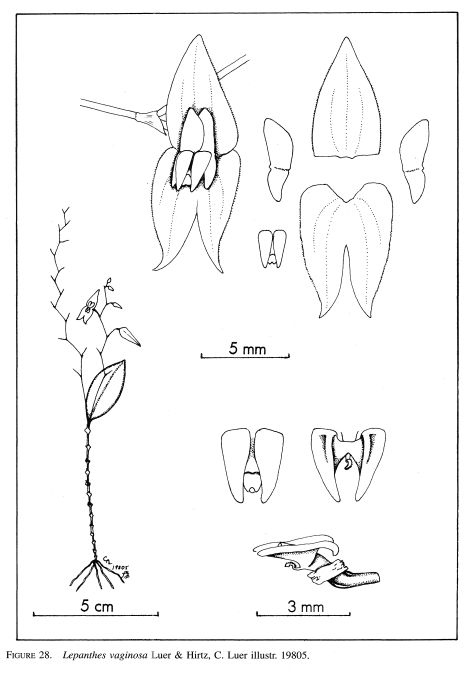 "This species from southeastern Ecuador is known from only the original collection. Vegetatively, it is remarkable in the number of short lepanthiform sheaths, a dozen squeezed onto a ramicaul 2.4" [6 cm] long. Similar to Lepanthes capitanea , a loose, flexuous raceme far surpasses the leaf. The comparatively large flowers are produced successively with a flower, a faded flower, and an advanced bud present simultaneously. The sepals are acute and microscopically ciliate; the lobes of the petals are obtuse; the blades of the lip are cuneiform, and the appendix resembles a tiny worm." Luer & Hirtz 2009
