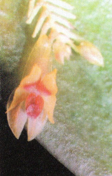 Found in Baja Verapaz department Guatemala in cloud forests at elevations around 1700 to 1800 meters as a miniature sized, cool growing epiphyte with slender, more or less horizontal ramicauls enveloped completely by 6 to 10, dark brown, microscopically scabrous lepanthiform sheaths and carrying a single, apical, spreading but erect in relation to the ramicual , thinly coriaceous, purple suffused beneath, ovate, acute, acuminate, acuminate below into the petiolate base leaf that blooms in the fall and early winter on a, congested, distichous, 1 to 1.32" [2.5 to 3.3 cm] long including the .6 to .92” [1.5 to 2.3 cm] long peduncle, successively single, many flowered inflorescence arising on top of the leaf with muricate floral bracts.
