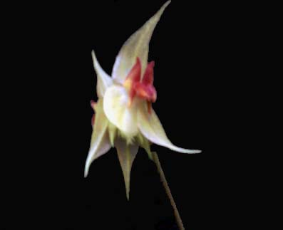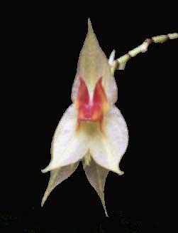 Found in Bolivia in cloud forests at elevations around 1750 to 2000 meters as a small sized, cool to cold growing epiphyte with erect, slender ramicauls enveloped completely by around 10, ciliate, lepanthiform sheaths with dilated ostia and carrying a single, apical, erect, elliptical, acute to acuminate, rounded basally leaf that blooms later spring and early summer on 1 to 2, arcuate, 2.8" [7 cm] long including the 1.6" [4 cm] long peduncle, successively single, few flowered inflorescence