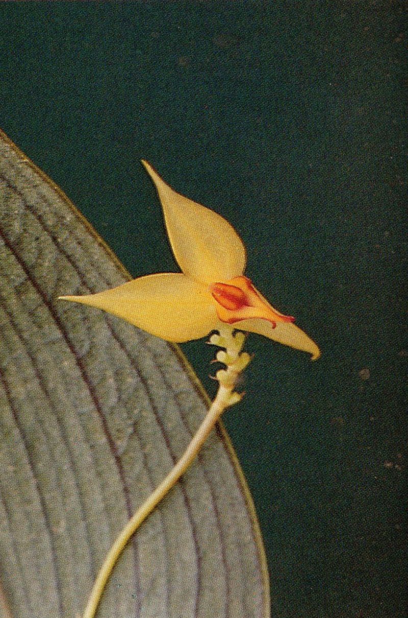 Found in Colombia and northern Ecuador at elevations around 2200 to 2250 meters as a miniature to small sized, cold growing epiphyte with an erect, stout ramicaul enveloped by 12 to 14, long-ciliate lepanthiform sheaths with dilated ostiacarrying a single, apical, erect, thinly coriaceous, ovate , acute to acuminate, rounded and contracted below into the petiolate base leaf that blooms in the fall on a filiform, congested, disitchous, 2.8 to 3.2" [7 to 8 cm] long including the 1.2 to 1.6" [3 to 4 cm] long peduncle, successively many flowered inflorescence arising on the back of the leaf.