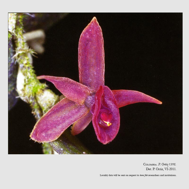 Found in Antioquia department of Colombia in cloud forests at elevations around 2590 meters as a miniature sized, cold growing epiphyte with ramicauls enveloped by 2 to 3, shortly ciliate lepanthiform sheaths and carrying a single, apical, descending, widely elliptic, glabrous, shortly ciliate margined, rounded below into the petiolate base leaf that blooms in the fall on a .08" [2 mm] long single flowered inflorescence.
