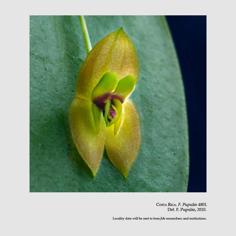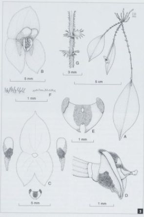 Found in Costa Rica in montane forests at elevations around 950 meters as a miniature sized, warm growing epiphyte with slender, erect ramicauls enveloped completely by 7 to 11, pubescent lepanthiform sheaths with dilated ostia and carrying a single, apical, pendulous, subcoriaceous, flat, conduplicate, oblanceolate to obovate, acuminate, minutely emarginate, abaxially provided with a short apiculae, narrowing and cuneate below into the petiolate base leaf that blooms in the spring on a, filiform, distichous, .4 to .48” [10 to 12 mm] long including the .2 to .28” [5 to 7 mm] peduncle, successively single, few flowered inflorescence exceeding the leaf in length.