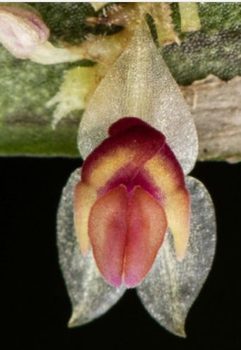 Found in Antioquia department of Colombia on moss-covered twigs and trunks near the border of a well preserved and orchid-rich mature forest along a river at elevations around 1540 meters as a minature sized, cool growing epiphyte with slender, suberect to horizontal ramicauls enclosed by 5 to 9 acuminate, ribbed, ciliate along the ribs lepanthiform sheaths, with ciliate dilated margins carrying a single, apical, more or less horizontal, coriaceous, occasionally suffused with purple along the veins on the adaxial surface, abaxially speckled with purple and suffused with purple along the veins, acrodromous and reticulate-veined, ovate to lanceolate, the apex attenuate, the rounded base contracted into the petiolate base leaf that blooms at least in the fall on. a congested, distichous, filiform, terete peduncle up to .8" [2 cm] long, borne near the apex of the ramicaul, 1.64" [4.1 cm] long including the peduncle, up to ¾ the length of the leaf, held appressed to the abaxial surface of the leaf, successively few, many-flowered inflorescence with conical, acuminate, ciliate, shorter than the pedicel floral bracts.
