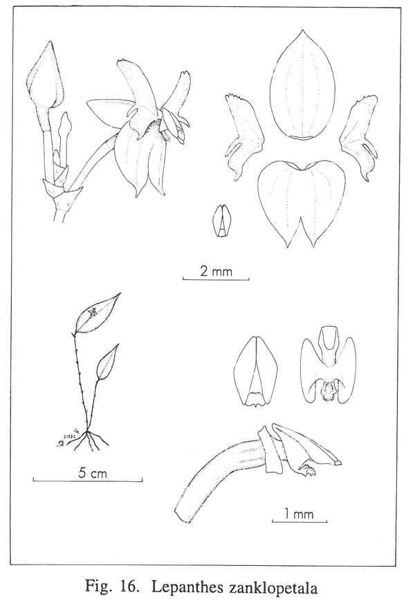 Lepanthes zanklopetala Luer & Hirtz 2009 SECTION Lepanthes SUBSECTION Lepanthes SERIES Mucronatae 1996 drawing by © Carl Luer and The Swiss Orchid Foundation at the Jany Renz Herbaira Website