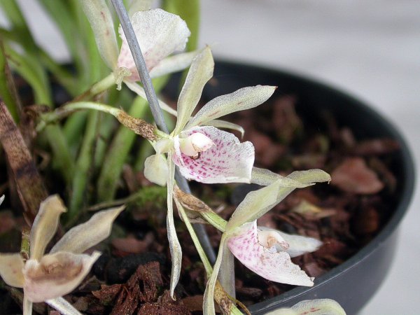 Found in Para, Maranhao, Mato Grasso, Goias and Espirito Santo states of Brazil at elevations of 200 to 1000 meters on a plateau with scattered hills as a miniature to small sized, hot to cool growing epiphyte with clustered, almost cylindrical pseudobulbs carrying a single, long-lanceolate, shallowly terete, non-flexible, light yellow green leaf that blooms on an arching, 2.4" [6 cm] long, 3 to 5 flowered inflorescence