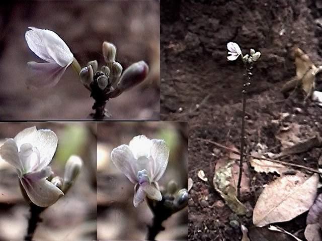 Found in the Chinese Himalayas Japan, Taiwan, Thailand and Vietnam in shady areas of broad leaved forests at elevations of 600 to 1000 meters as a mini-miniature to small sized, warm growing, mycoheterotrophic terrestrial orchid with an erect, 2.8 to 11.2" [7 to 28 cm] long, laxly 3 to 20 flowered inflorescence with 2 to 3 scalelike, brown sheaths and ovate floral bracts that blooms in the spring and carrying a few flowers in a group confined to the apex.