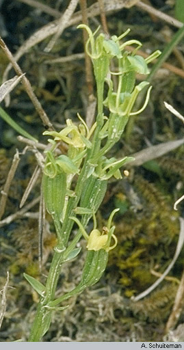 Found in Papua New Guinea on wet open slopes, mossy rock faces, and subalpine grasslands at elevations of 2300 to 3575 meters as a miniature sized, cold growing terrestrial with psuedobulbs enveloped completely by a few glabrous, leaf like sheaths and carrying a single, apical, patent, coriaceous, glabrous, narrowly elliptic, falcate-plicate, acute leaf that blooms in the later fall and early winter on a terminal, 3.6" to 5" [9 to 12.5 cm] long, 6 to 9 flowered, racemose, glabrous inflorescence enveloped basally by 3 to 4, broadly ovate, acute, conduplicate scales and has ovate, caudate-acuminate, auricled basally, 1-nerved, slightly warty floral bracts and carry mostly non-resupinate flowers.