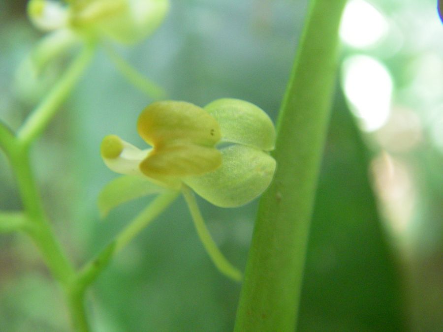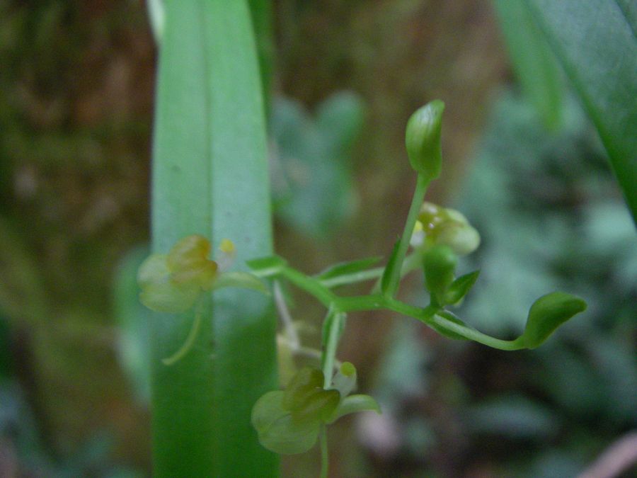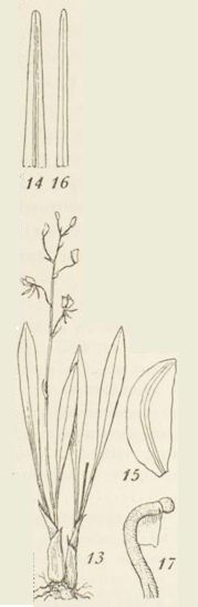 Found in Madagascar in montane forests at elevations around 900 to 1600 meters as a small sized, warm to cool growing epiphyte or terrestrial with small, suborbicular to ovoid pseudobulbs carrying 2 to 3, oblanceolate-linear, finely many veined, attenuate base leaves that blooms in the summer through earlier fall on an erect, longer than the leaves, 4.8 to 6.4" [12 to 16 cm] long, peduncle bare below the middle, above with 4 to 7 sheaths with acute limbus, rachis slightly sinuous, 10 to 20 flowered inflorescence with 3 veined, hyaline, very acute, shorter than half the length of the ovary floral bracts.
