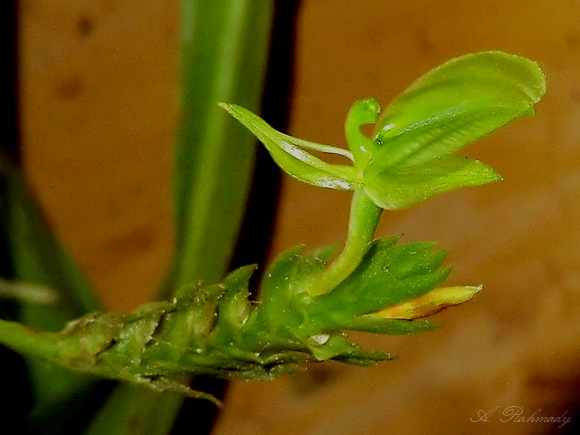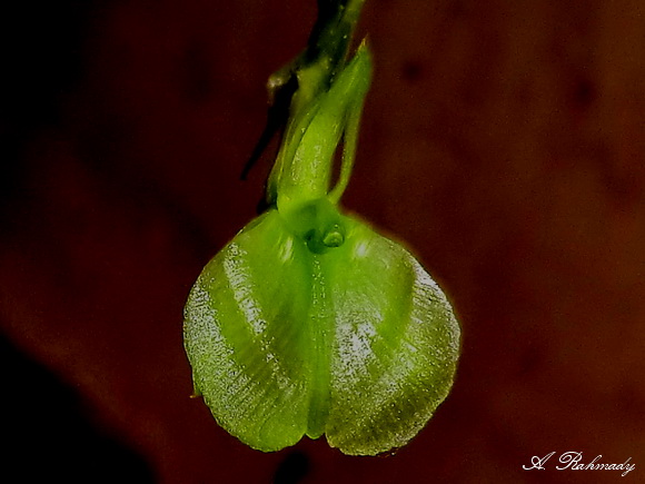 Found in western Sumatra in moss forests on ridges at eleavations of 1600 to 2200 meters as a small sized, cool to cold growing terrestrial with a creeping rhizome with .44 to .56" [1.1 to 1.4 cm] between each oblong to ovaste, much flattened pseudobulb carrying a lanceolate to strap shaped, acute leaf that blooms on an erect, terminal, much shorter than the leaf, peduncle, very much flattened, thickening towards the apex, 3.28 to 4.8" [8.25 to 12 cm] long, bent towards the apex, the rachis almost nodding, flattened, successively single, many flowered inflorescence