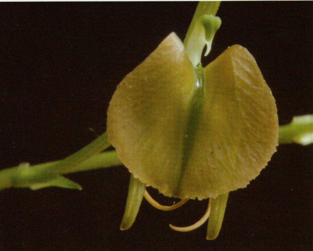 Found in Yunnan and southern Hainan provinces of China at elevations around 800 meters as a miniature to small sized, warm growing terrestrial with an elongate rhizome with .6 to 1.6" [1.5 to 4 cm] between each narrowly subcylindrical to narrowly ovoid-cylindric pseudobulbs carrying a single, apical, articulate, elliptic, narrowly elliptic to oblong, papery, acuminate, contracted below into the petiolate base leaf that blooms in the fall on an erect, peduncle compressed, narrowly winged, 2.8 to 5.6" [7 to 14 cm] long, rachis .2" [.5 mm] long, 3 to 4 flowered inflorescence with green, lanceolate to narrowly lanceolate, shorter to as long as the ovary floral bracts