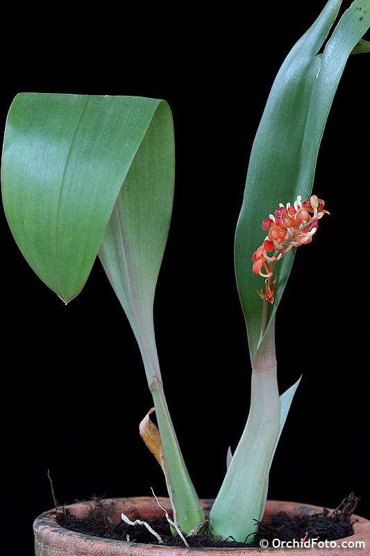 Found in Thailand, Malaysia, Java and Sumatra at elevations around 1400 to 1700 meters as a medium sized, cool growing epiphyte with close set, elongate [to 8" - 20 cm] long pseudobulbs carrying 2 to 3, apical, narrowly lanceoalte, acute, narrowing gradually into the base leaves that blooms on a as long as the leaves, white, to 16" [40 cm] long, many flowered inflorescence.