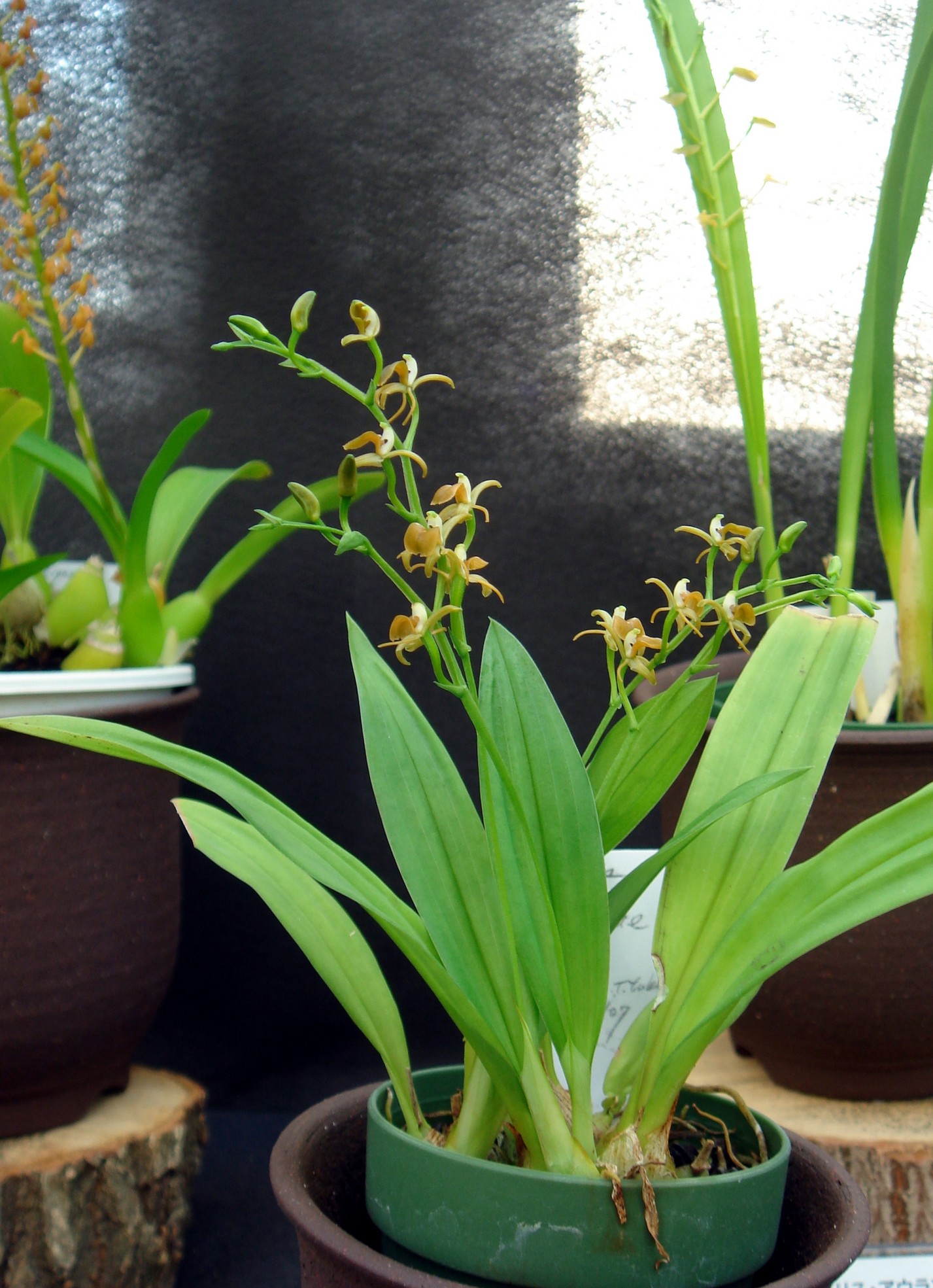 Found in Assam India, eastern Himalayas, Bhutan, Myanmar, Laos, Cambodia, Yunnan China, Vietnam, Borneo, Java, Lesser Sunda Islands, the Philippines, Sumatra and Taiwan, Ryukyu Islands and Japan in humid, mossy, mixed and coniferous forests and primary highland cloud forests at elevations of 1000 to 2300 meters as a miniature sized, cool to cold growing terrestrial [Java], lithophyte or epiphyte [Philippines] with clumping 1" pseudobulbs each with a pair of bright green veined 8" leaves, spikes are 14" [35 cm] long and carry up to 20 small flowers which open during a couple of months, the .72" [1.8 cm] blooms are apple-green with a dark-green stripe down the middle of the square lip, free flowering.