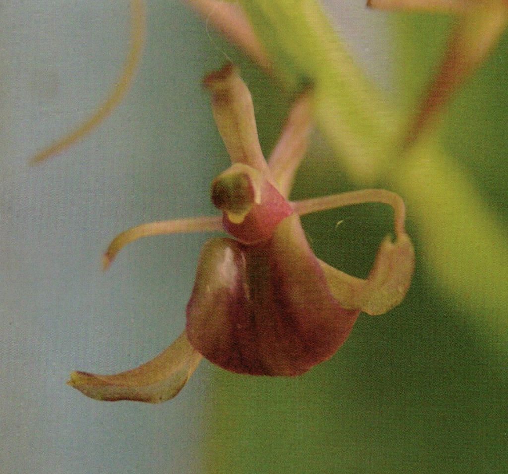 Found in Guangdong province of China in swampy thickets as a mini-miniature sized, cool to cold growing terrestrial with clustered, elliptic to sub quadrate, laterally compressed, truncate apically pseudobulbs enveloped by 3 sheaths and carrying 1 to 2, ovate-elliptic to suborbicular, naot artuiculate, subacute apically, contracted below into the sheath base leaves that blooms in the early spring on a .6" to 2.6" [1.5 to 6.5 cm] long, laxly 1 to 5 flowered inflorescence with ovate-lanceolate, acute apically floral bracts.