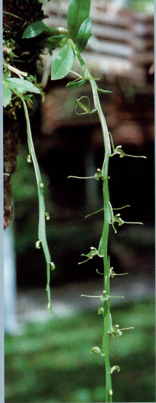 Found in Guinea, Sierra Leone, Liberia, Ivory Cost, Nigeria, Cameroon and Gabon as a mini-miniature sized, hot growing epiphyte with close set, clylindric-curved, tapering pseudobulbs carrying 5 to 6, deciduous, flowering with the leavse, dstichous, basally twisted, flat elliptic to oval, subacute leaves that blooms in the late spring on a terminal, pendent, 5.6 to 8" [14 to 20 cm] long, thick cylindric, lowermost 1 to 2 aborted, laxly 10 to 15 flowered inflorescence with linear, floral bracts.