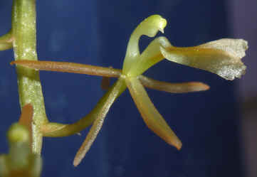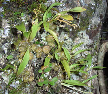 Found in New South Wales and Queensland at elevations of 50 to 800 meters on trees and cliff faces in rainforests in deep shade as a miniature sized, warm growing terrestrial with globose, green, deeply grooved pseudobulbs enveloped partially by papery bracts and carrying 2, apical, thin-textured, pale green to yellowish leaves that blooms in the spring and summer on an often pendulous, 4 to 8” [10 to 20 cm] long, 8 to 20 flowered inflorescence