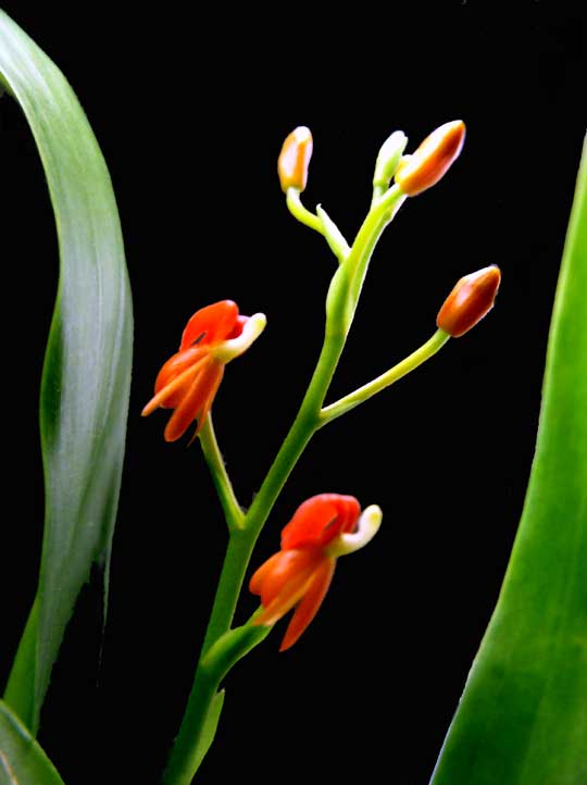 Found in Java and Sumatra in wet montane forests at elevations of 650 to 2200 meters as a a medium sized, warm to cold growing terrestrial long-ovoid pseudobulbs spaced [6 to 12 cm] apart and enveloped basally by 4, imbricating sheaths and carrying 2, apical, lanceolate, acute, gradually narrowing into the base leaves that blooms in the fall on a semi-erect to horizontal, to 14.4" [to 36 cm] long, many flowered inflorescence with triangular, acute floral bracts.