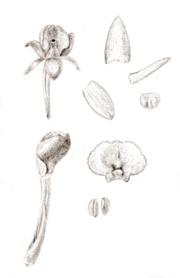 Found in western New Guinea in primary and secondary hill and montane forest at elevations around 450 to 1300 meters as a small to medium sized, hot to cool growing terrestrial with a creeping, short rhizome giving rise to close set, erect, oblong, in cross section elliptic pseudobulbs carrying 3 to 4, erect, not articulated, divergent, linear-strap-shaped, acute, 5-nerved, the three inner nerves closely spaced, the outer nerves above indistinct, mid-rib grooved above, keeled underneath, sheath short, somewhat narrowed and conduplicate, clasping base leaves that blooms in the later spring on a terminal, arising through a conduplicate, acuminate, sharply acute, 1.28" [3.2 cm] long spathe, erect, shorter than the leaves, peduncle angular, with small longitudinal ribs, 4.4" [11 cm] long, with several linear-lanceolate, acute scales, rachis 1.2" [3 cm] long or more, 1.2" [3 cm] wide across the flowers, conical-racemose at the apex densely many-flowered inflorescence with appressed, basally ovate, long and sharply auminate, concave floral bracts and carrying flowers with the sepals dull yellow with greenish tips, the petals pale greenish brown, the Lip orange with a shiny base, the column pale brownish orange, the anther green with two indistinct yellow spots and ochrish yellow pollinia.