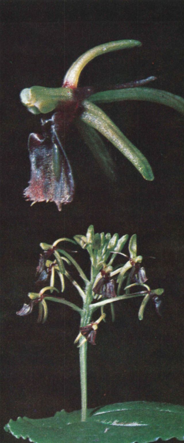 Found in central to southwestern Mexico and Guatemala in pine/oak forests amongst mossy rocks at elevations of 2200 to 2400 meters as a small sized, cold growing terrestrial or lithophyte with sub-erect to horizontal, pyriform corms giving rise to a propagating, horizontal rhizome with a few bracts and turning upward for 4.2" [10.5 cm], then giving rise to a single, cordate, sessile, flat, obtuse to shortly acuminate, undulate, 5 nerved, whitish green leaf that blooms in the mid summer through early fall on a terminal, erect, 1.2" [3 cm] long, sub-capitate, successively several flowered inflorescence with reduced, projecting almost horizontally, canaliculate, triangular-acuminate, glabrous, pale green floral bracts and carrying resupinate flowers.