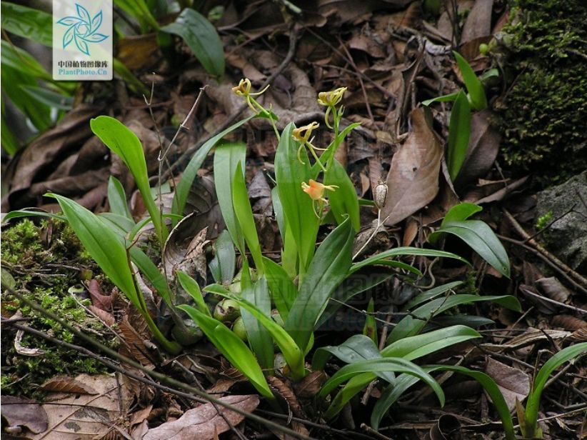 Found in Guizhou province of China among shaded rocks at elevations around 900 meters as a miniature to small sized warm growing terrestrial with close set, cylindrical pseudobulbs carrying a single, oblong to ligulate, narrowing below into the shortly petiolate base leaf that blooms in the spring on a compressed, cylindric, to 7.6[19 cm] long, longer than the leaf, narrowly winged, laxly 10 flowered inflorescence with narrowly lanceolate, shorter than the ovary floral bracts and carrying orange-yellow flowers.