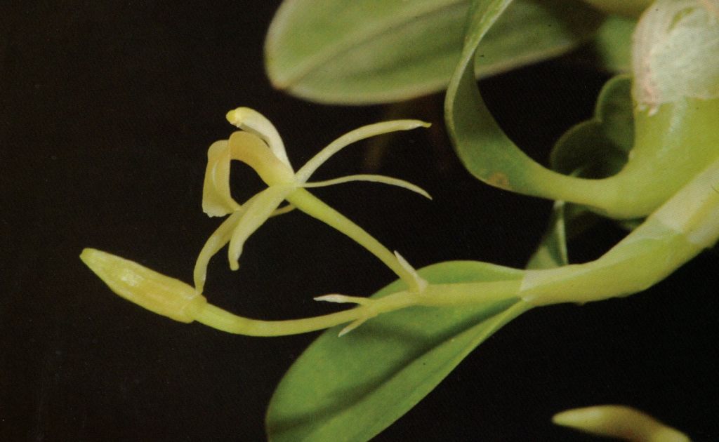 Found in southern China on trees or rocks in shady montane areas at elevations around 300 to 1700 meters as a mini-miniature sized, hot to cool growing epiphyte or lithophyte with prostrate, subcylindrical pseudobulbs with new pseudobulbs arising from near the apex of the previous pseudobulb carrying a single, membraneous, elliptic to oblong, rounded to obtuse, narrowing below into the petiolate base leaf that blooms in the early fall on a compressed, cylindric, 1.2 to 2.4" [3 to 6 cm] long, 2 to 3 flowered inflorescence with narrowly lanceolate floral bracts.