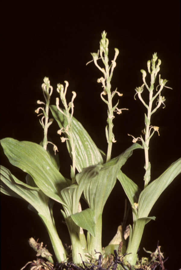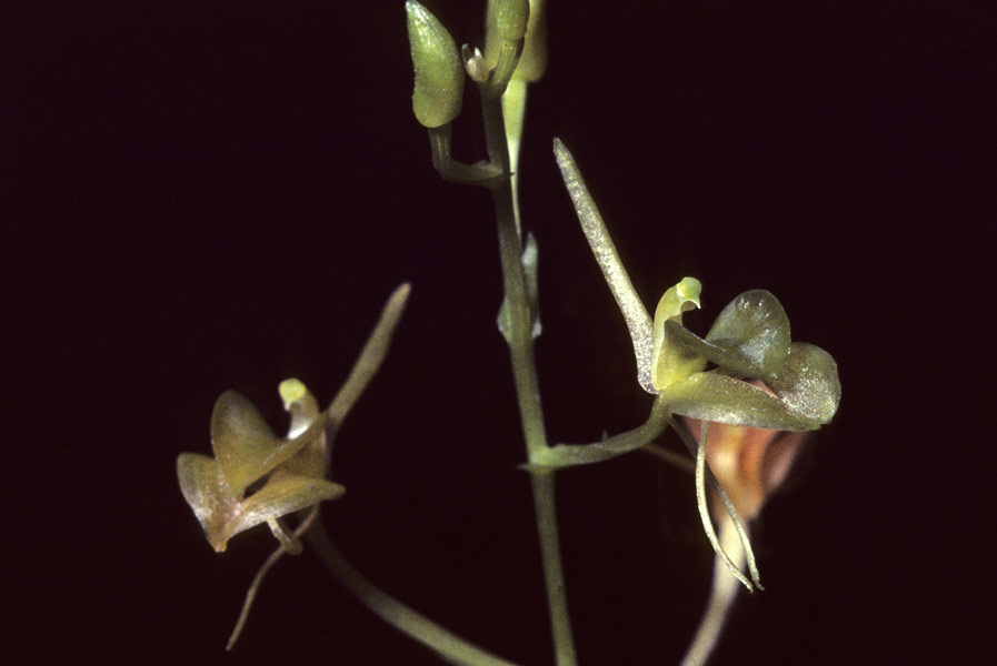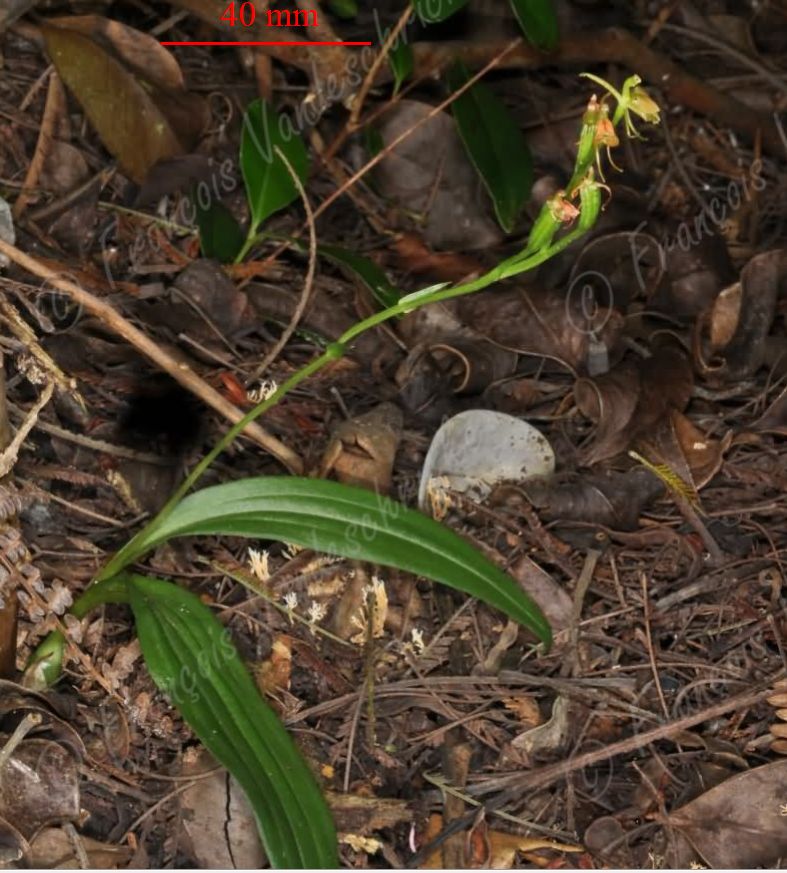 Found in Madgascar, Mauritius, Reunion and the Seychelles as a mini-miniature sized, warm growing terrestrial with oblique, the most recent pseudobulb carrying 3 to 4, plicate, suberect, lanceolate to oval, acute leaves that blooms in the spring on a longer than the leaves, to 3.2" [to 8 cm] long, loose, several flowered inflorescence with oval-lanceolate, acuminate, mostly equalling half as long as the pedicel floral bracts.
