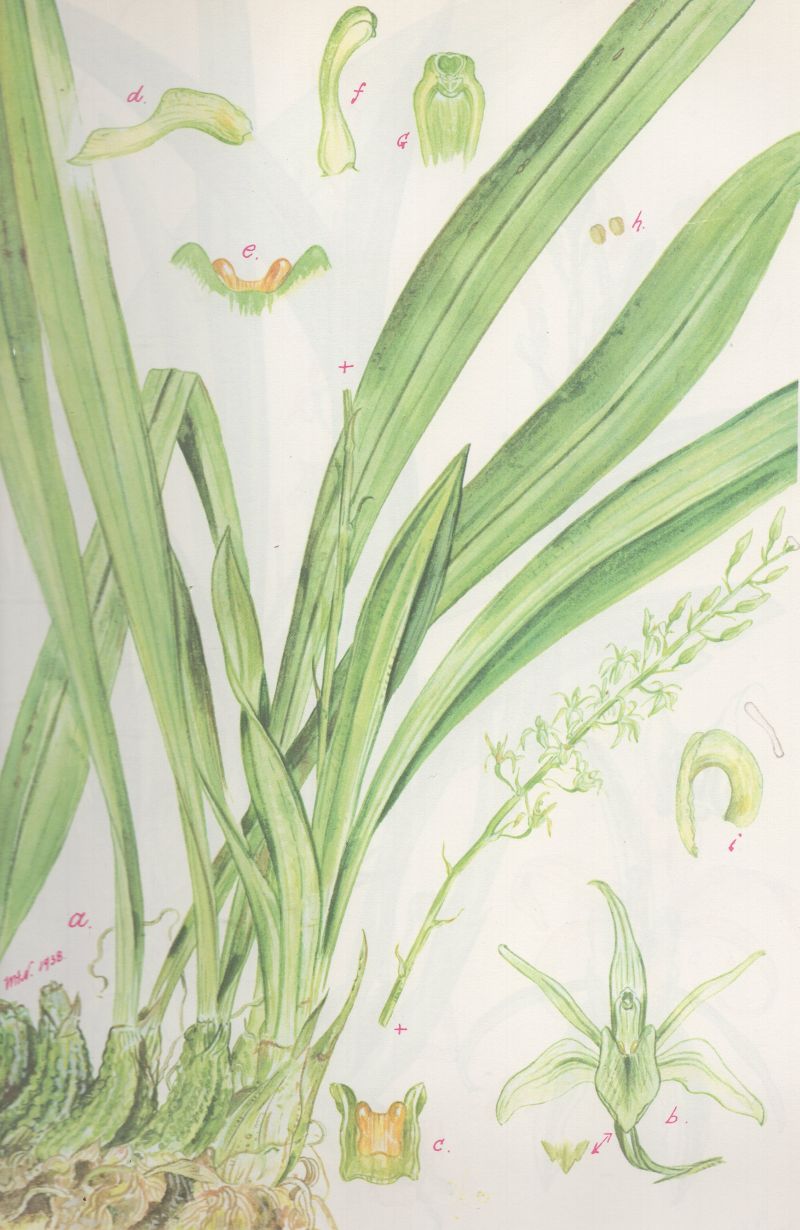Found in northern and northeastern Queeensland Australia in highland rainforests on trees and rocks at elevations of 900 to 1600 meters as a medium to large sized, warm to cool growing epiphyte or lithophyte with fleshy, dark green pseudobulbs with wrinkled ridges carrying 2, apical, thin textured, dark green, acute leaves that blooms in the fall through winter on an erect, 6 to 10" [15 to 25 cm] long, 5 to 20 flowered inflorescence