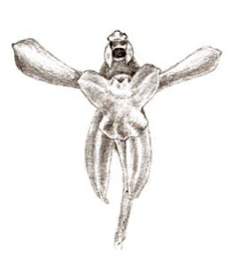 Found in western New Guinea in lowland forests on riverside trees at elvations around 400 meters as a miniature sized, hot growing epiphyte with a creeping, elongated, branched, bent, subterete rhizome enveloped by distichous, tubular, acute, keeled, becoming larger towards the apex sheaths and giving rise to very small, .52 to .8" [1.3 to 2 cm] between each, at an acute angle to the rhizome, obliquely ovoid pseudobulb initially covered with conduplicate, acuminate, acute, keeled, sheaths that increase in size upwards and carrying a single, erect, articulated, linear, mid-rib grooved above, keeled below, conduplicate base leaf that blooms in later spring on an erect, peduncle ancipitous, 4 to 4.4" [10 to 11 cm] long, near the middle .24 to .32" [0.06 to 0.08 cm] wide, at the apex dilated to .6 to .68" [.15 to .17 cm], provided with pectinate bracts, rachis compressed, flexuose, at least .52" [1.3 cm] long, at the apex successively single, densely several-flowered inflorescence with distichous, patent, lightly conduplicate, acute, strongly keeled, dorsally curved, lowermost longer floral bracts and carrying orange, very small flowers
