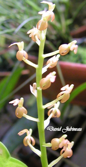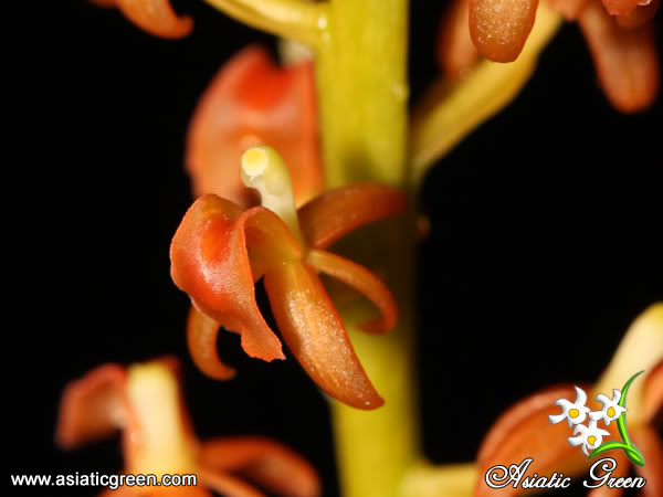 Found in Myanmar, Taiwan and the Philippines on trees on broad leaved forest slopes at elevations around 300 to 500 meters as a small sized, hot growing epiphyte with close set, bottle-shaped, flattened pseudobulbs carrying 2 to 3, loined, leathery, oblong-lanceolate, very obtuse, unequally bilobed leaves that blooms in the fall on a terminal, 12" [30 cm] long, many flowered, cylindric, racemose inflorescence with overlapping,oblong-lanceolate, tapering apically bracts.