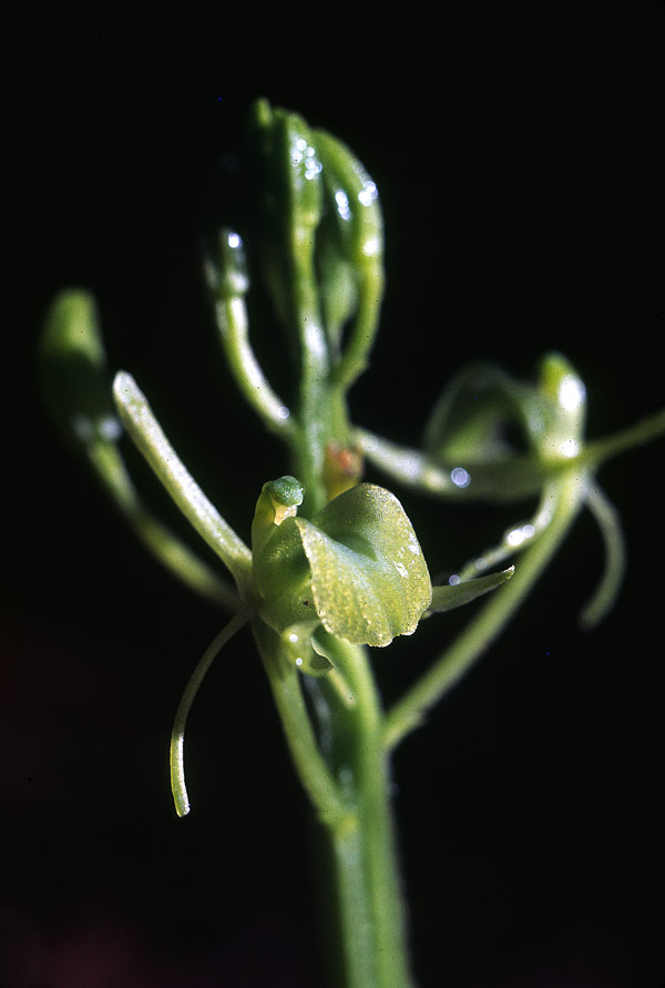 Found in Hawaii at elevations of 700 to 1500 meters as a small sized, warm to cool growing terrestrial with a semi-globose pseudobulb enveloped by dry sheaths and carrying 2, apical, delicate, glossy green, oblong-elliptic, keeled beneath leaves that blooms in the later spring through mid fall on a terminal, erect, to 8" [20 cm] long, 3 to 12 flowered inflorescence with a mniscule floral bract