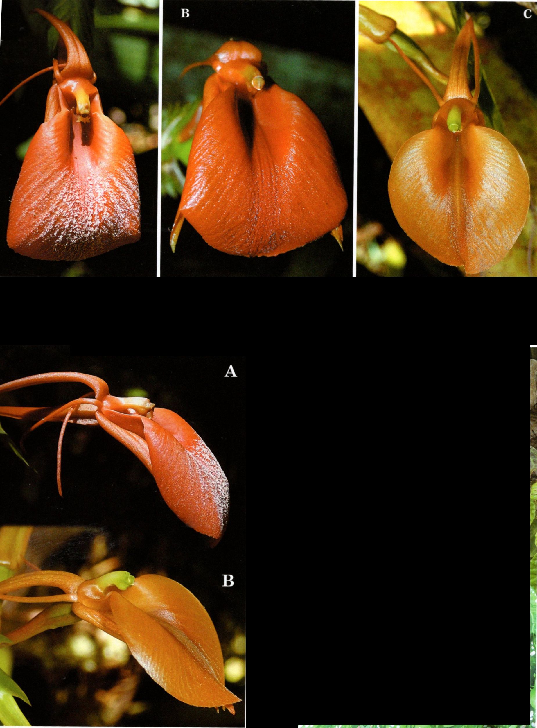 Found in Sabah Borneo in hill primary and lower montane forests at elevations of 800 to 1600 meters as a medium sized, warm to cool growing epiphyte with a creeping rhizome giving rise to erect, bottle-shaped,green to yellow green, basally compressed, ovoid-conical, apical part, compressed, cylindrical, one margin sharp-edged, the other with 2 sharp edged wings pseudobulbs enveloped basally by 3 to 6 persistent, conduplicate, acute bracts and carrying a basally jointed, erect, proximal part conduplicate, distally flattening and broadening, narrowly elliptic to narrowly obovate, green, obtuse leaf that blooms in the late spring through mid winter on an erect to arching, shorter than the leaf, peduncle 2.4 to .7.2" [6 to 18 cm] long, broadening before the rachis, flattened and conspicuously 2 winged, green, rachis bifarious, compresssed, 1.28 to 2.6" [3.2 to 6.5 cm] long, successively 2 to 60 flowered inflorescence with crowded conduplicate, triangular, acute, shorter than the ovary floral bracts.