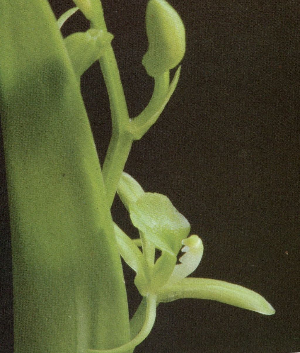 Found in Fujian and Guangdong provinces of China as a mini-miniature sized, cold growiong epiphyte with globose to ovoid pseudobulbs carrying a single, apical, erect, subelliptic to oblong, acuminate, petiolate base leaf that blooms in the summer on an erect, peduncle sometimes compressed, very narrowly winged, 1.2 to 2.2" [3 to 5.5 cm] long overall, rachis to .6 to 1" [1.5 to 2.5 cm] long, 5 to 6 flowered inflorescence with narrowly lanceolate floral bracts