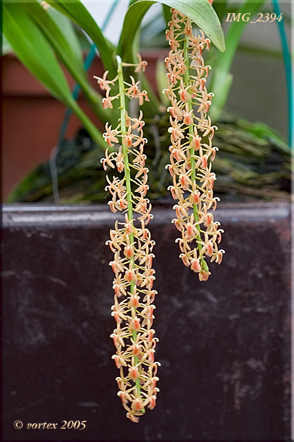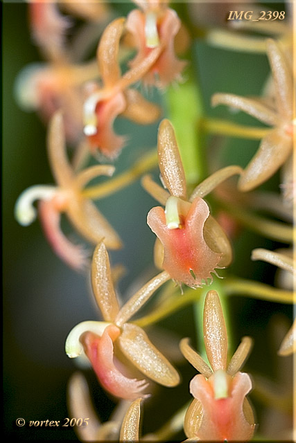 Found from Indo-China to Western Malaysia, Myanmar, Borneo and Sumatra in lowland, riverine, peat-swamp and mixed hill forests at elevations around sealevel to 600 meters as a small sized, hot to warm growing epiphyte with ovoid, slightly compressed laterally pseudobulbs carrying 2, apical, lanceolate, acute leaves that is equally narrowed to the elongate, petiolate base that blooms on an erect then pendulous, 18" [45 cm] tall, loosely many [60] flowered inflorescence with narrowly triangular, subulate, acute, orange floral bracts.