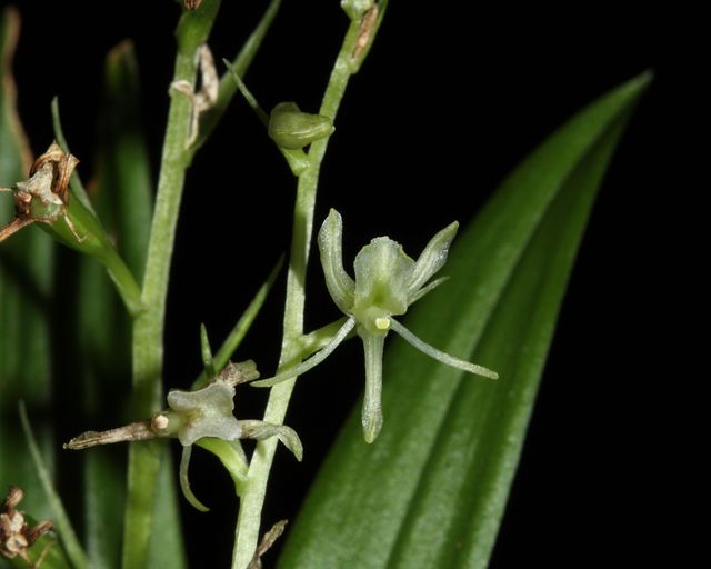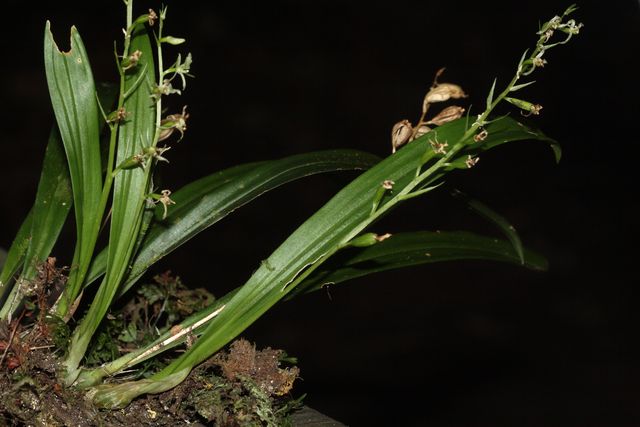 Found in Taiwan in laurel forests at elevations of 900 to 1500 meters as a mini-miniature sized, warm to cool growing epiphyte with approximate, globose, somewhat obliquely complanate pseuedobulbs with broadly ovate, acuminate basal sheaths and carrying a single, erect, oblanceolate-linear, slightly leathery, acute, long-decurrent basally leaf that blooms in the fall on an angular, to 4" [10 cm] long, laxly 10 to 15 flowered inflorescence with linear, acute to acuminate apically floral bracts.
