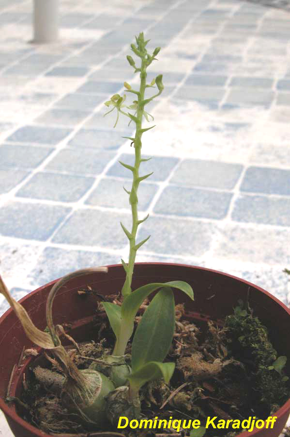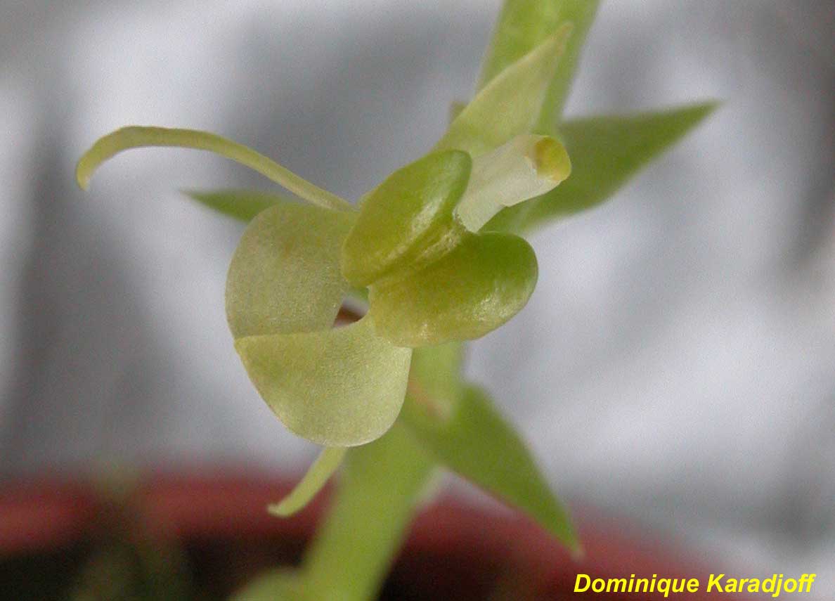 Found in Madagascar in humid evergreen forests at elevations around 1500 meters as a miniature to small sized, cool growing terrestrial with oval, small, thick pseudobulbs enveloped basally by white sheaths, the uppermost 2 being leafbearing lanceolate-acute, plicate leaves that blooms in the late summer on a 5" [12.5 cm] long, longer than the leaves, loosely 6 to 7 flowered inflorescence with 1 to 3 bracts and a small, acute floral bract.