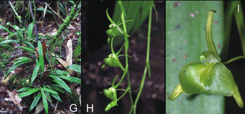 Found in Vietnam on mossy cliffs or steep slopes in primary evergreen, mixed and coniferous forests, commonly on mossy pillows at elevations of 1200 to 1400 meters as a small sized, cool growing epiphyte, lithophyte or occasional terrestrial with a thin rhizome close set, narrowly ovoid to ovoid, often slightly oblique pseudobulbs carrying a single, apical, oblanceolate, herbaceous, triangular acute apically, conduplicate below, tapering towards the base leaves that blooms in the fall on a slender, straight to arching to pendulous, indistinctly secund, wingless to very narrowwinged, peduncle 4.8 to 10.4" [12 to 26 cm] long, provided with 1 to 14, sterile, linear to narrowly triangular, conduplicate, acuminate bracts, rachis 2 to 4.8" [5 to 12 cm] long, laxly, 3 to 12 flwoered inflorescence with linear, narrowly triangular, often subulate, membraneous, light greenish to almost white much shorter than the ovary floral bracts.