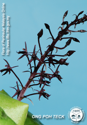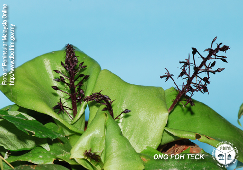 Found in Malaysia and Sumatra on cliff faces and wet rocks in open forest at elevations of 70 to 1300 meters as a small sized, hot to cool growing terrestrial or lithophyte with a single, ovate-acute leaf with several basal sheaths beneath that blooms on a 6" [15 cm] long, many, closely set flowered inflorescence.