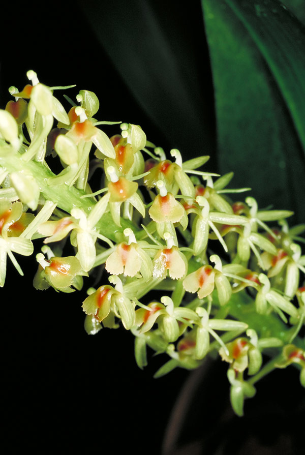 Found in west Sumatra at elevations around 600 to 2000 meters as a small sized, warm to cool growing epiphyte with a very short rhizome giving rise to narrowly oblong, slightly flattened, narrowing towards the apex pseudobulbs carrying a single, more or less erect, elliptic to strap-shaped, narrwoign below into the base leaf that blooms on a terminal, erect, angular, peduncle terete, longer than the leaves, 8.8" [22 cm] long overall, laxly 10 to 20 flowered inflorescence with lanceolate, acuminate, shorter than the ovary floral bracts.