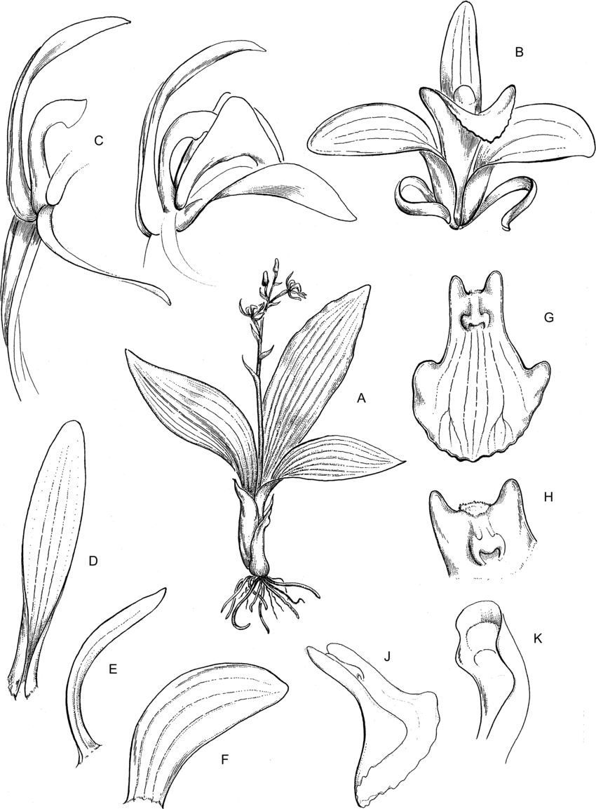 Found in southeastern Madagascar in humid forests at elevations of 600 to 1600 meters as a miniature to small sized, warm to cool growing epiphyte with 2 conical, erect pseudobulbs carrying 2 to 3 elliptic-lanceolate, acute to acuminate, attenuted below into the petiolate based leaves that blooms in the late spring and summer on a terminal, erect, 5 to 13" [12.5 to 32.5 cm] long overall, peduncle provided with a basal sheath and 2 to 5 sterile bracts above, loosely 4 to 12 flowered inflorescence with lanceolate-acuminate, as long as to longer than the ovary floral bracts and carrying flowers that open greenish and become brownish with age.