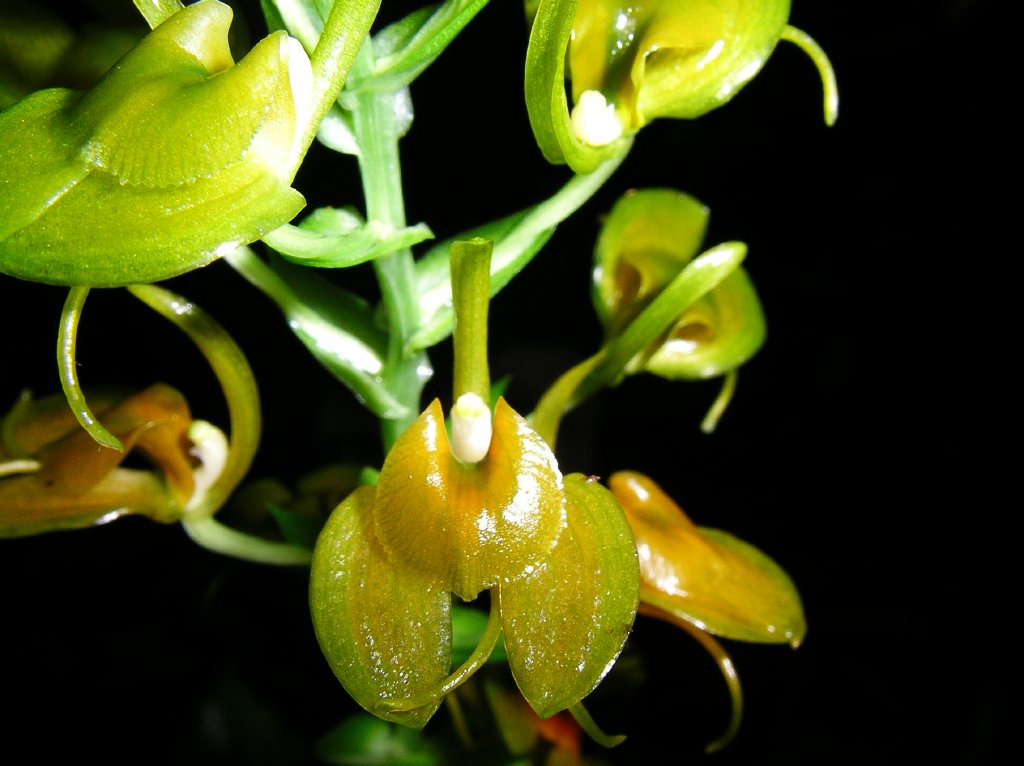 Found in Madagascar in humid, lichen rich evergreen forests at elevations of 700 to 2000 meters as a small sized, warm to cool growing terrestrial with 2 pseudobulbs, the oldest obliquely diverging and the younger enveloped by 3 to 4, elliptical to oval elliptical, obtus to apiculate, compressed and rounded basally, gradually narrowing below into the clasping, petiolate base leaves that blooms in the summer and earlier fall on an erect, to 6" [to 15 cm] long, 6 to 12 flowered inflorescence