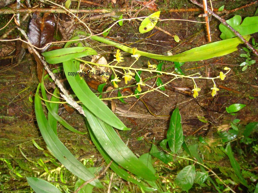 Found in Java, Sumatra and the Philippines in montane forests at elevations of 1000 to 2500 meters as a medium sized sized, cool to cold growing terrestrial with close set, basally ovoid, gradually narrowing towards the apex pseudobulbs carrying a single, apical, lanceolate, acute, arising from a narrow base leaf that blooms in the fall and winter on a terminal, erect, to 16" [40 cm] long, to 50 flowered, longer than the leaf inflorescence with lanceolate, acute, longer than the pedicels and ovaries floral bracts.