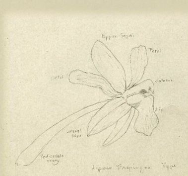 Found in the Philippines as a miniature to small sized, hot growing terrestrial with a woody rhizome giving rise to close set, bottle-shaped pseudobulbs enveloped basally by scarious foliaceosu sheaths and carrying a single, apical, erect, linear-oblong, acute, rigid, subcoriaceous, gradually anrrowing below into the base leaf that blooms in the fall on a double winged, provided with distichous, close set, conduplicate, acute bracts, thin, 4.8” [12 cm] long, successively few, several flowered inflorescence and carrying small, orange flowers.