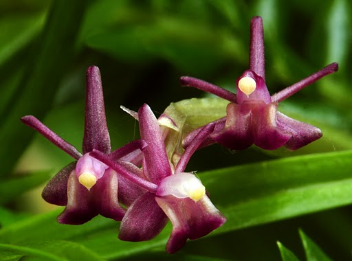 Found in Thailand, Malaysia, Vietnam, Java, Lesser Sunda Islands, Sulawesi, Sumatra and New Guinea in hill and lower montane forests at swamp edges in partial shade at elevations of 450 to 1500 meters as a small to medium sized, hot to cool growing epiphyte with close set, cylindrical pseudobulbs enveloped completely by leaf bearing sheaths and carrying 3 to 5, ovate, acuminate, acute, plicate, thin leaves that blooms in the winter and summer on an 8 to 18" [20 to 45 cm] long, 4 to 5 winged, many flowered inflorescence with the successively opening flowers that get smaller ascending the inflorescence.