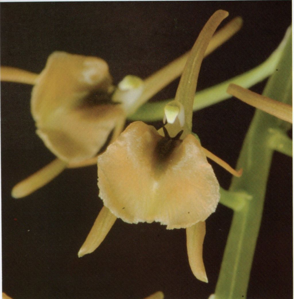 Found in Yunnan province of China on rocks as a mini-miniature sized, warm to cool growing lithophyte with approximate, ovoid-subcylindric pseudobulb arising from the base of the previous psuedobulb enveloped by several subacumiante sheaths and carrying a single, apical, thin, oblong-ligulate to ligulate-oblanceolate, acute apically leaf that blooms in the fall on a terminal, erect, narrowly winged, 7.2 to 8" [18 to 20 cm] long, to 20 flowered inflorescence with lanceolate, acute floral bracts.