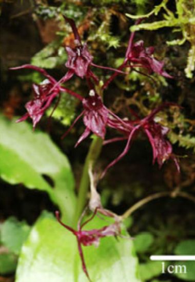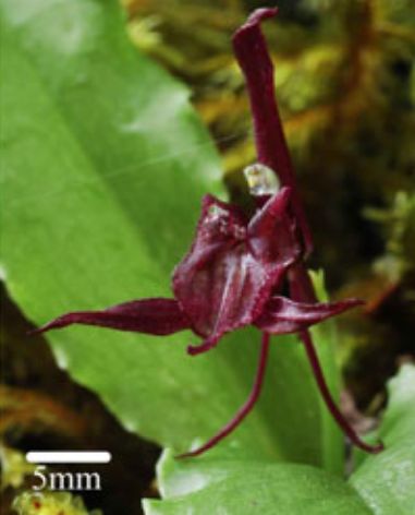 Found in central Taiwan in forests at elevations of 1500 to 2000 meters as a mini- miniature sized, cool to cold growing terrestrial or lithophyte with flattened, ovoid pseudobulb carrying 2, subsessile, not articulate, obovate, membraneous to herbaceous, acute to obtuse apically, narrowling below into the cuneate base leaves that blooms in the later spring on a 3.2" [8 cm] long, 5 flowered inflorescence with lanceolate floral bracts