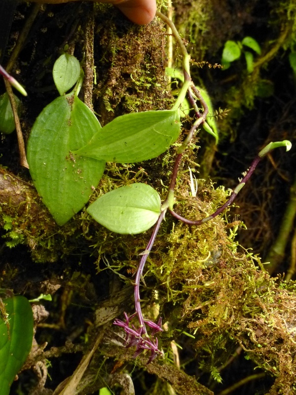 Found in Colombia and Ecuador in dry montane cloud forests on mossy branches near the ground at elevations around 2600 meters as a small sized, cold growing epiphyte or terrestrial with a creeping, terete stem with several nodes between each broadly obovate, acute to apiculate, heavily parellel veined on the underside, subcordate basally, terete petiolate base leaves that blooms in the early summer through mid fall on an erect, to 4.8" [12 cm] long, loosely many flowered inflorescence with triangular floral bracts and carrying pale translucent green flowers with purplish veins on the lip.
