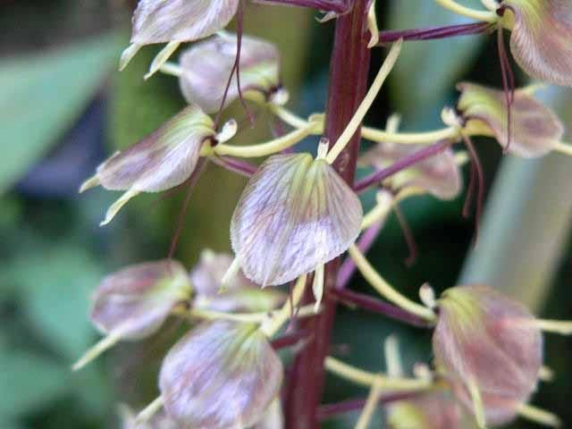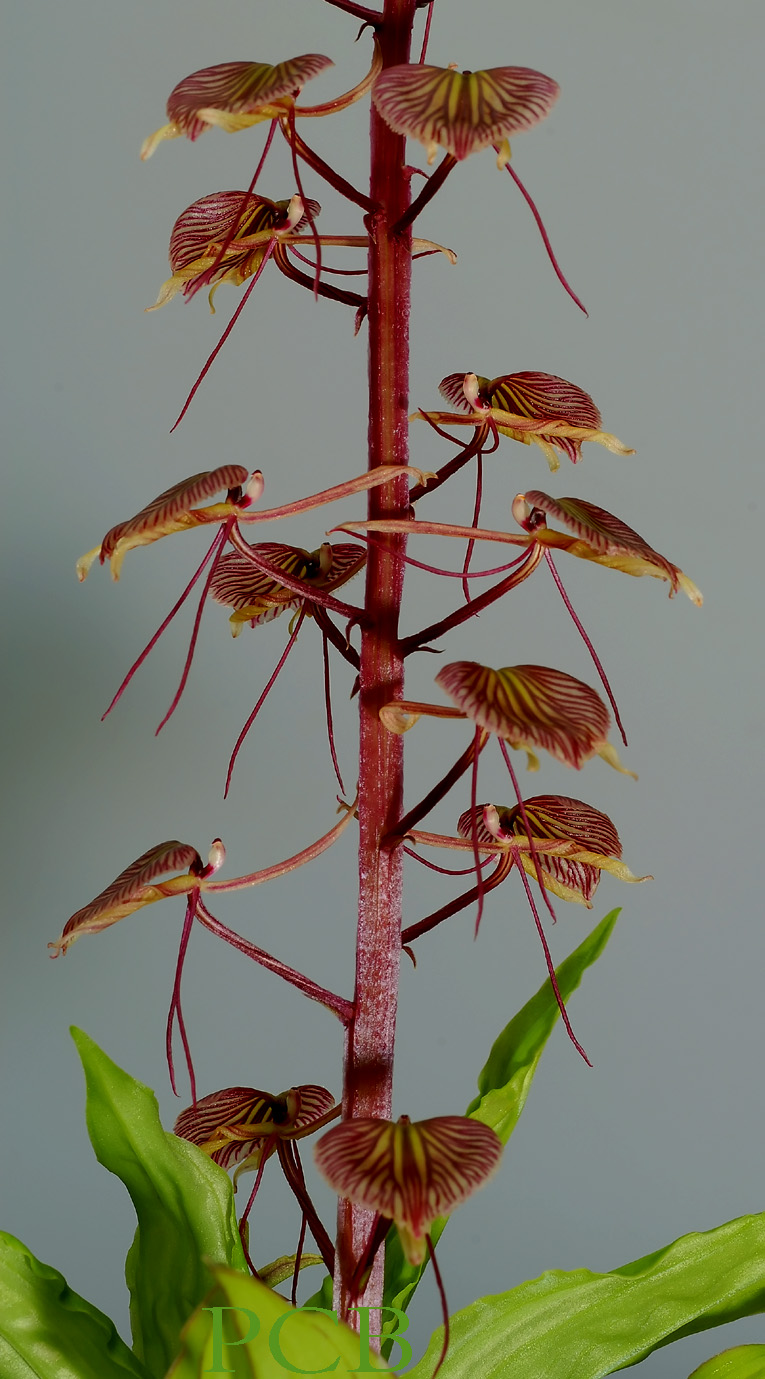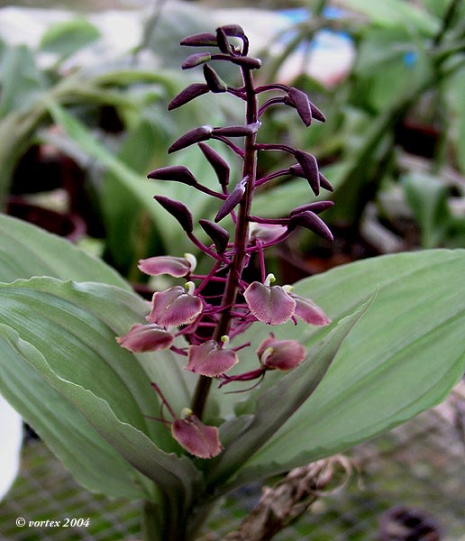 Found in Malaysia, Borneo, Sumatra and the Phillipines in peat, swamp and lower montane forests at elevations around sea-level to 1500 meters as a large sized, hot to cool growing terrestrial with flattened, cylindrical pseudobulbs carrying several, plicate, oblong, acute leaves with the edges crisped and pinkish that blooms in the summer on a 24" [60 cm] long, stout, purple many flowered inflorescence with irregular spaced flowers.